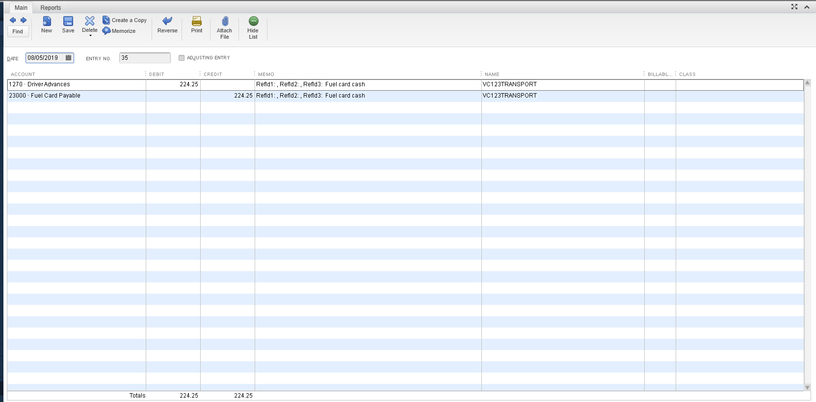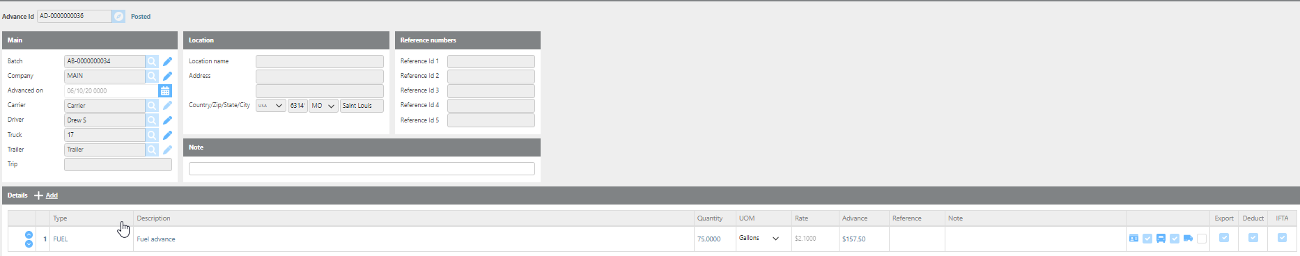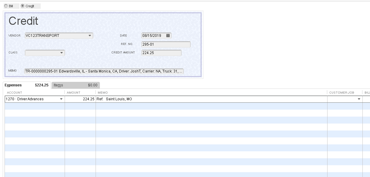 For example, if a fuel advance was deducted from carrier VC123Transport, a Vendor Credit will be created for that carrier and the Driver Advances account will be debited.