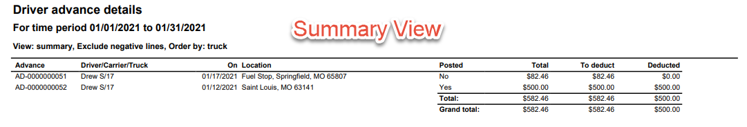 Truck | If a truck is selected, only advances associated with that truck will display. |