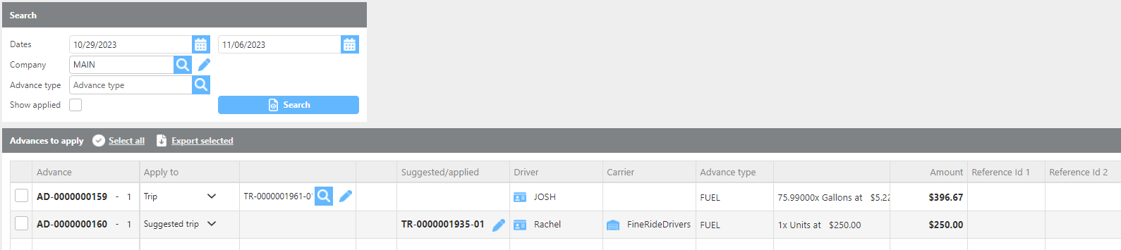 Suggested/Applied | Displays the trip the system suggested, or how the advance was actually applied if the suggestion was changed. |