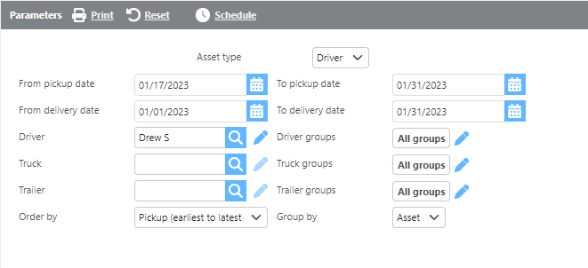 List of trips with the scheduled and actual in and out times and miles per load. This report can be ran for the asset types of Driver, Truck, or Trailer.