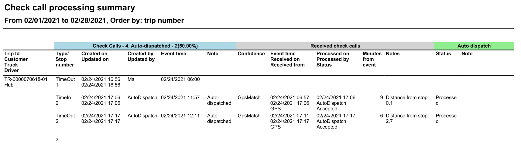 Processed on Processed by Status | Processed on time - Time that the pending check call was processed. (Added to the TMS by Auto Dispatch or a dispatcher accepting the pending check call) Processed by - The user that processed the check call. Status - If the check call was accepted. |