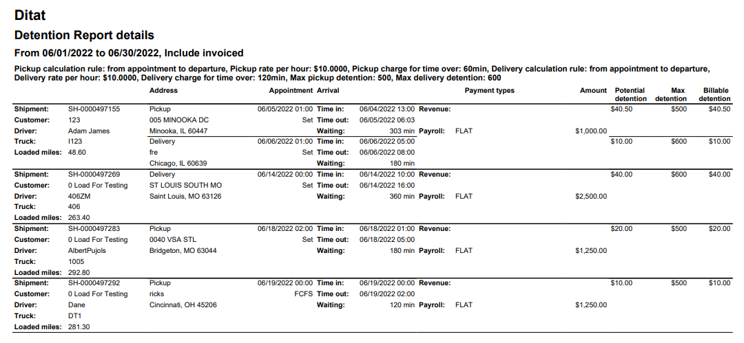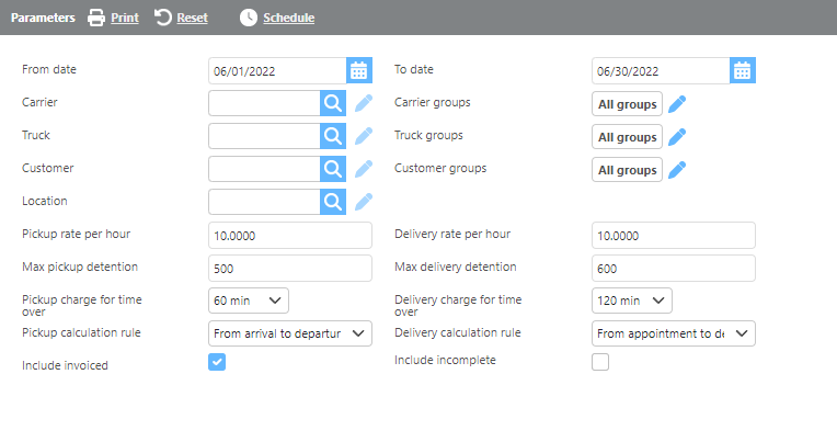 This report displays potential detention charges based on the rates and rules you specify for the selected date range.