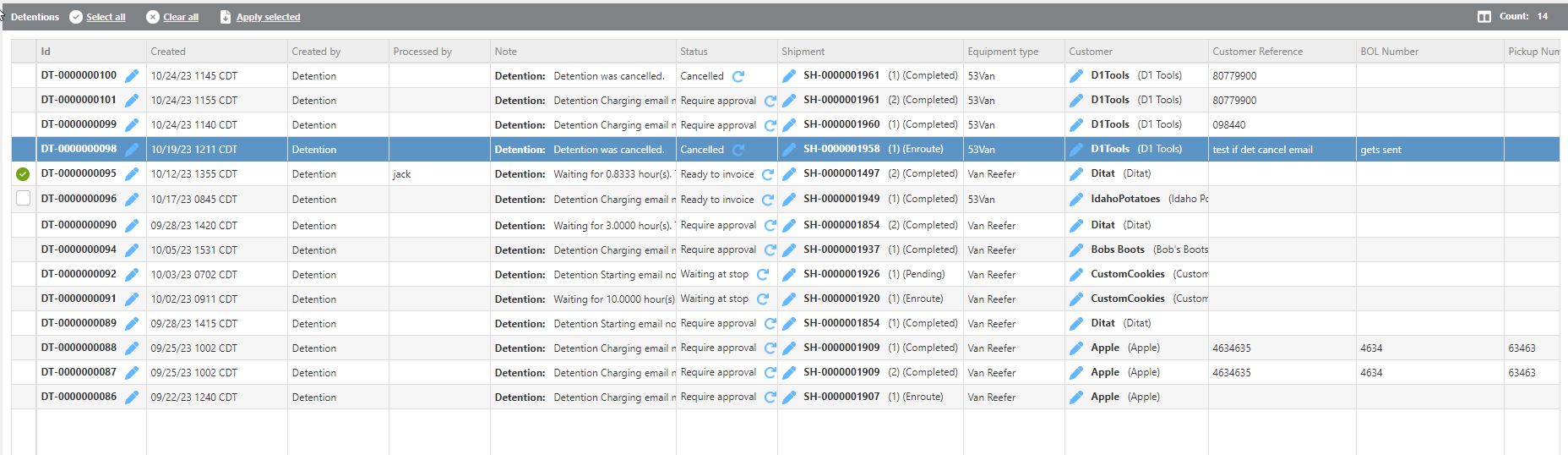 To apply detention charges to a shipment, check the box to the left of each detention you want to apply, then click Apply Selected.