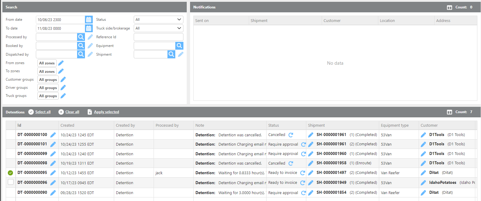 The Notifications section displays a list of detentions that are possible but have not yet officially started. These are loads for which notification emails have been sent to alert the relevant parties of a potential detention, but no actual detention charge has been created in the system yet.