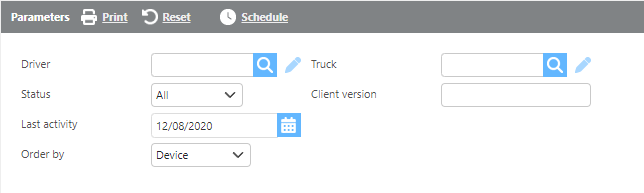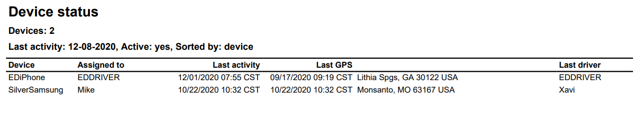 This report shows the device, the driver it was assigned to, the last activity, the last GPS location, and the last driver that was assigned to the device.