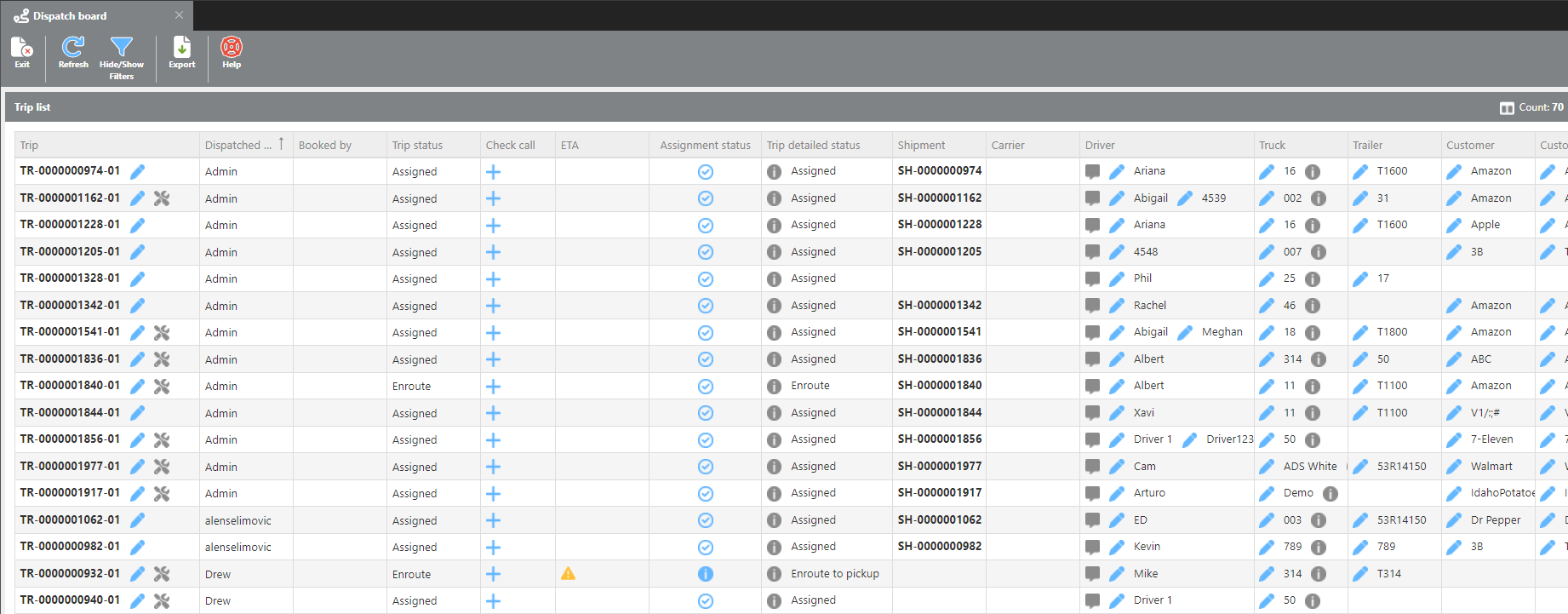 The DITAT Dispatch Board is intended to allow the User to be in control of current Trips in DITAT. The board gives the ability to customize data to each viewers specifications through filters and groups.