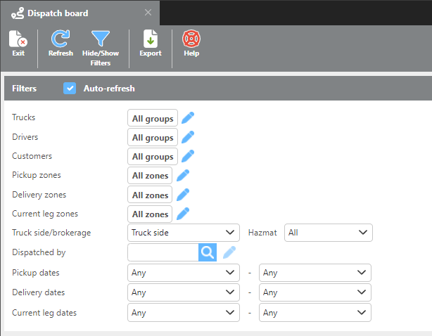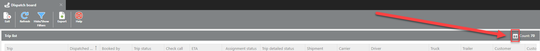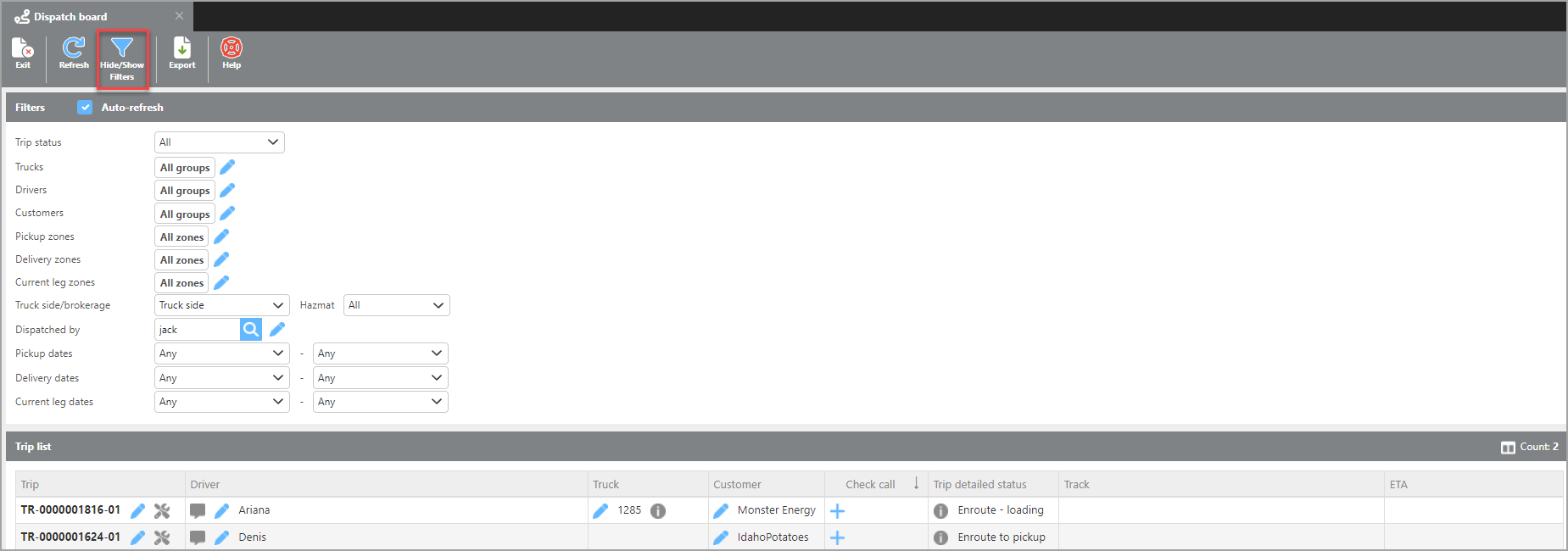 The Hide/ Show Filters icon will toggle if the extensive filter section of the Dispatch Board can be seen. Giving the option to view more Trips after the desired filters have been set.