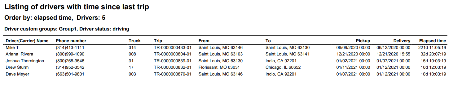 This report displays the most recent trip for each driver or carrier along with trip details and the time elapsed since the trip was completed.