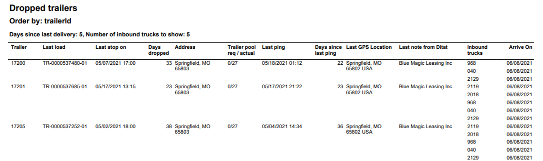 Inbound trucks | This field will show the truck number for trucks that are currently assigned on a trip that delivers at the location of the dormant dropped trailer. |