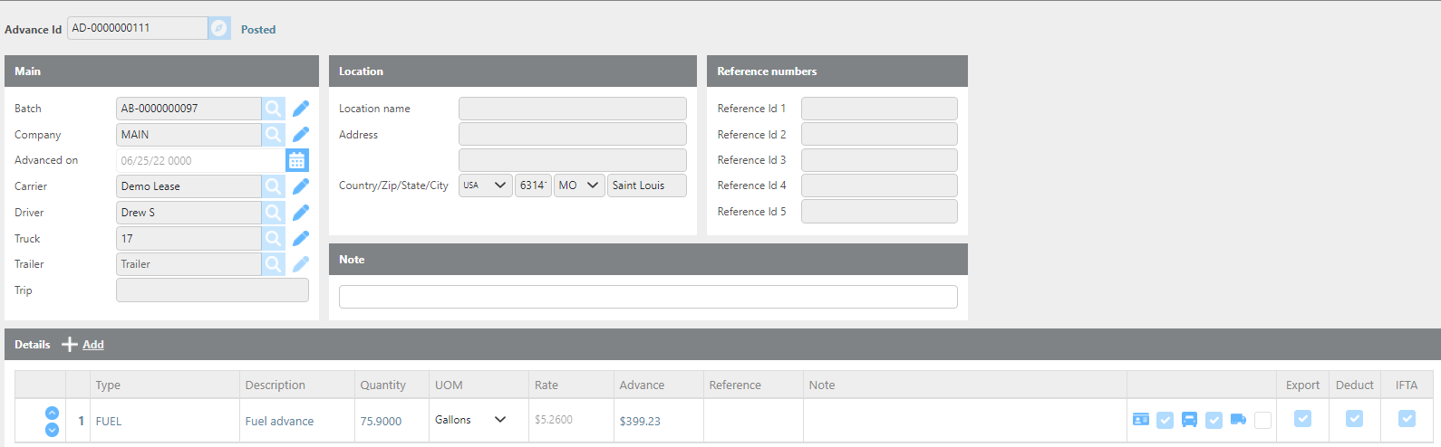 Note | Enter any notes for this advance line. For daily fuel card imports, this is filled in by the fuel card provider. |