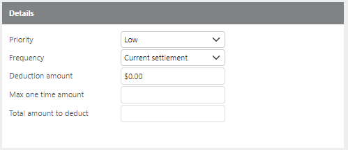 Frequency | Select whether this is a Current Settlement, Weekly, or Monthly deduction. |