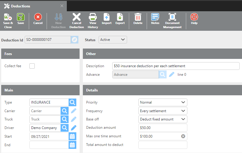 Deductions can be set up to occur weekly, monthly, or on the current settlement only. Common uses include trailer deposits, mobile device charges, and driver loans.