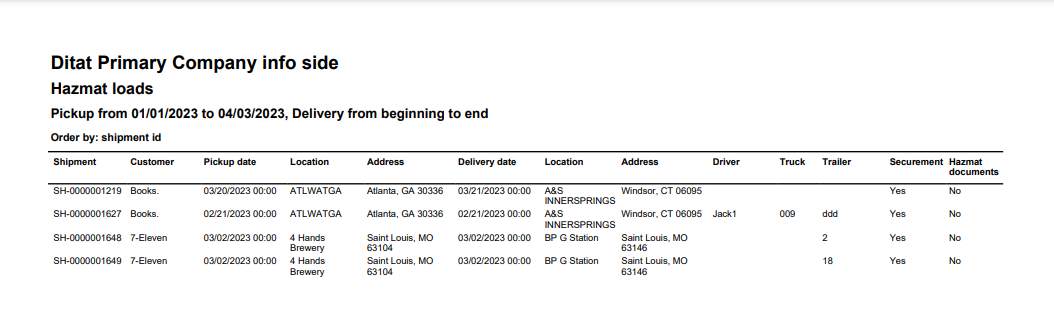 This report will provide a list of hazmat loads with pickup information and equipment used.