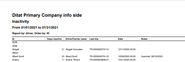 This report can be run by driver, truck, or trailer providing the number of days of inactivity with the last trip.