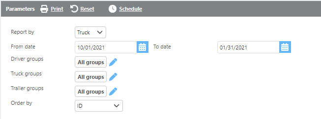 Report by | Here select if the report should be run for trucks, trailers, or drivers. |