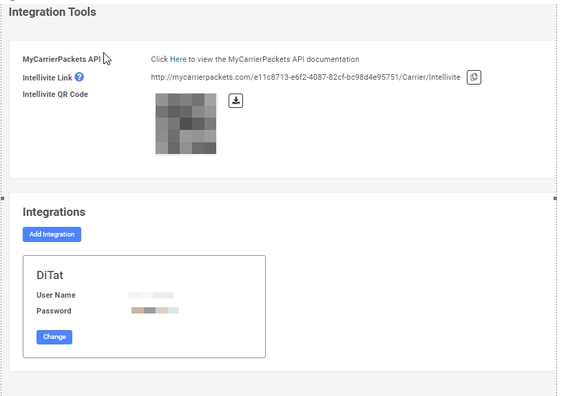 Once you add the integration you will get a screen like the one below where you can add the User name and password that needs to be entered into Ditat.
