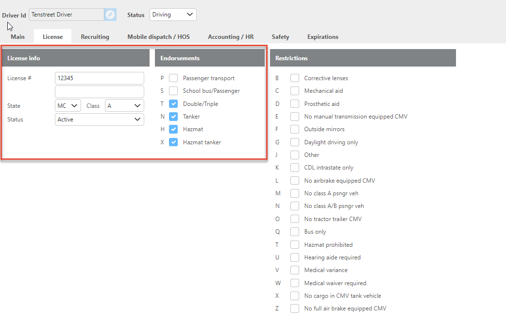 Endorsements | This field will populate from Tenstreet. (Double/Triple, Tanker, Hazmat, Hazmat tanker are applicable with the integration) |