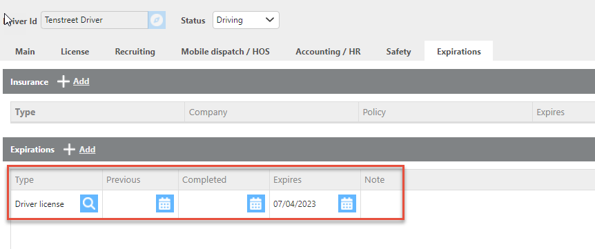 Expirations | The driver's license field will populate from Tenstreet. |