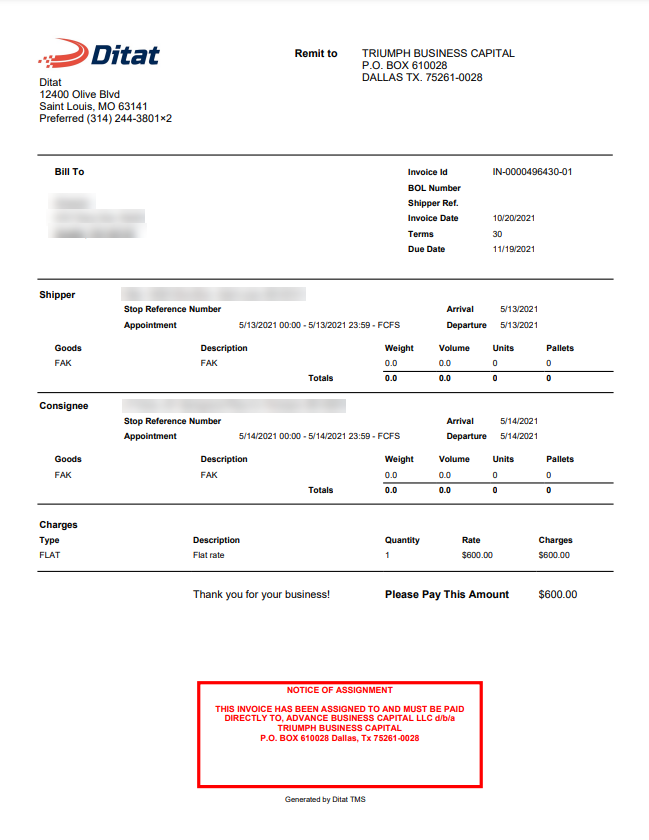 Ditat provides a separate invoice template — Invoice Triumph — that must be used when factoring with Triumph. This template should be selected on the customer profile for all customers billed through Triumph.