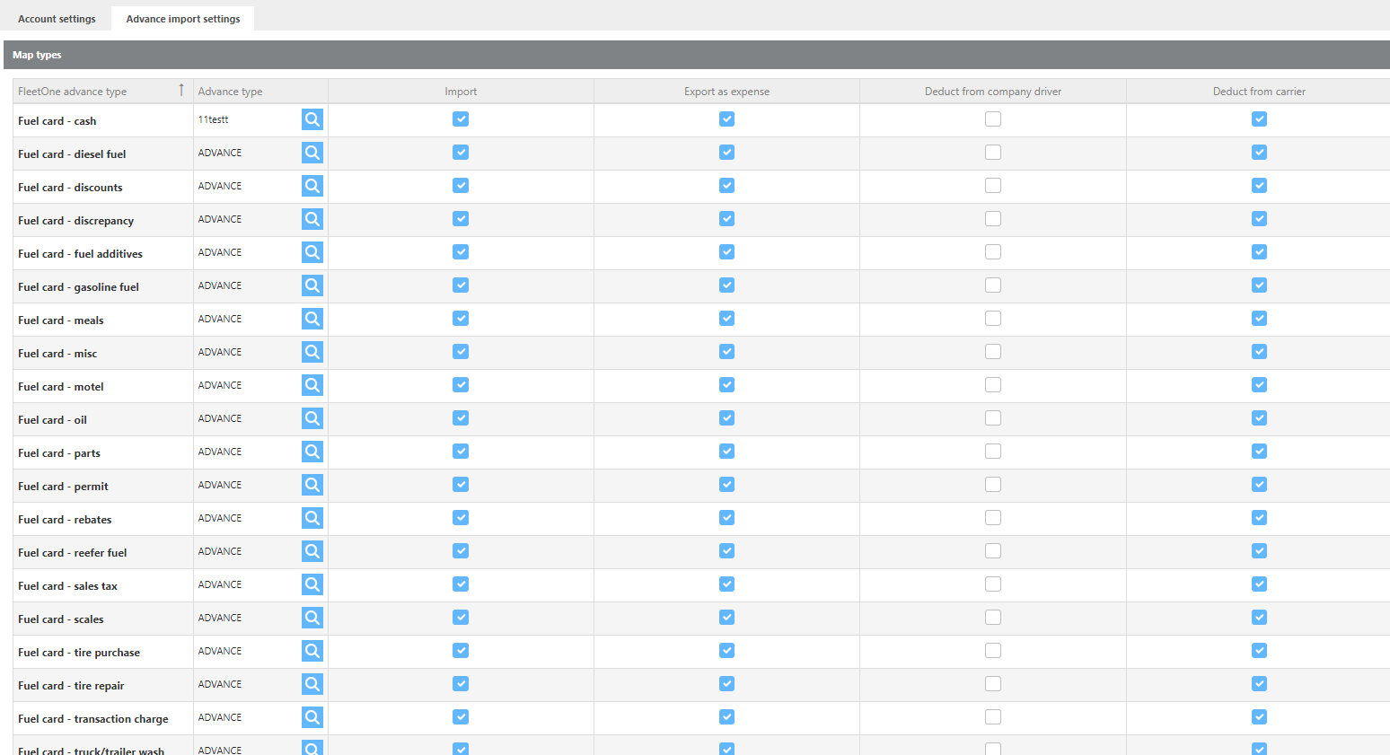FleetOne advance type | These are the advance types that FleetOne will send over for your account. |