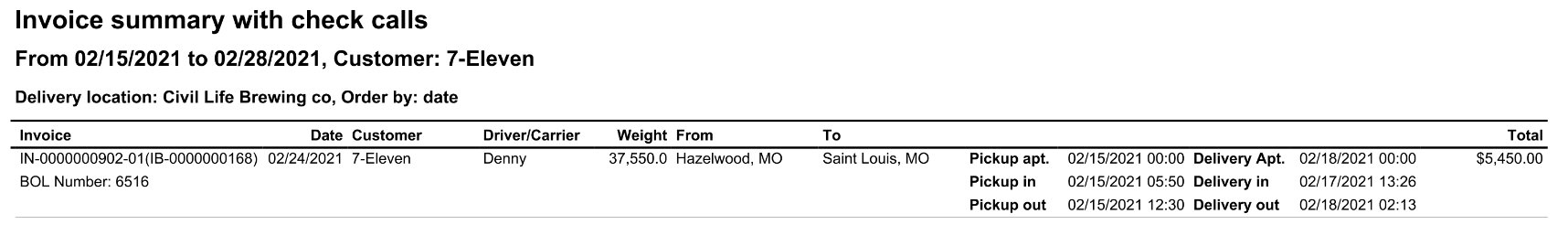 This report will show invoices with check call data for the date range selected.