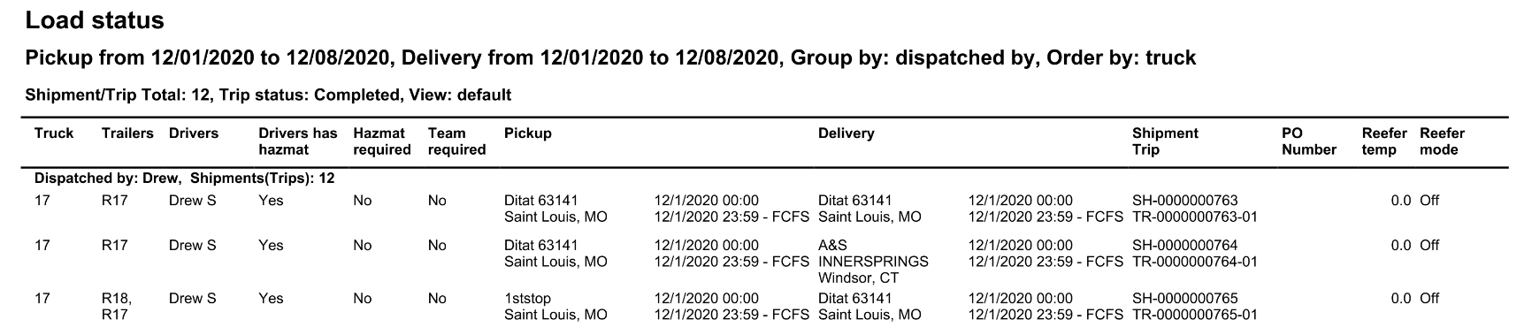 Default View will Show: If your load is hazmat, if the driver has a hazmat endorsement, if a team is required, as well as the status of the load with reefer information.