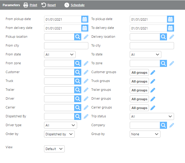 Groups | Here you can choose from your custom groups. If a group is selected the report will only show loads for the selection in the group. |