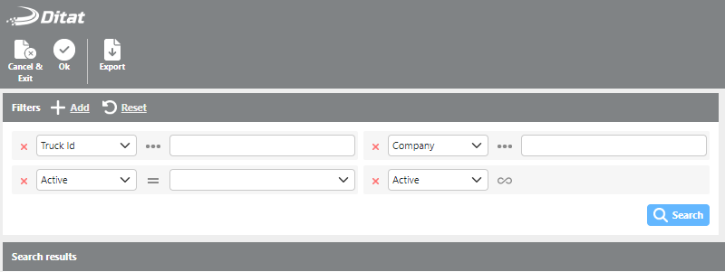 Many windows in the Ditat TMS allow you to either type a record ID manually or click the Search button in the navigator field to open a lookup window. The lookup window lets you search through all existing records using a variety of parameters.