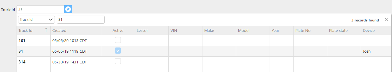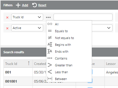 Select the Ends With filter for the VIN parameter and enter 8. After clicking Refresh, the results will display all trucks with a VIN ending in 8