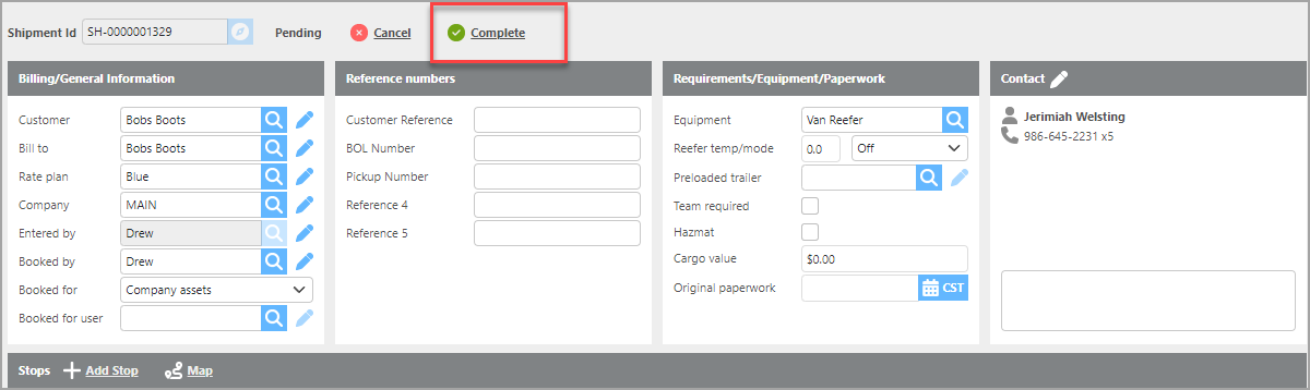 Complete the second shipment – The second shipment will need to be marked as complete separately to make it ready to invoice. Click the Complete button on the second shipment — it does not need to be assigned to a trip to be invoiced.