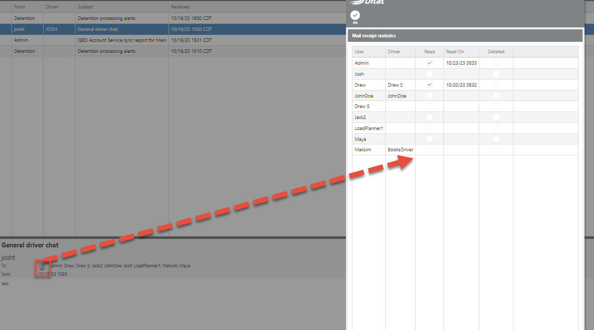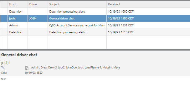 The Ditat TMS has a built-in messaging function that allows all users — including those on mobile devices — to send and receive messages. All messages are stored in the Ditat TMS database and are never routed through third-party servers, ensuring your information remains private.