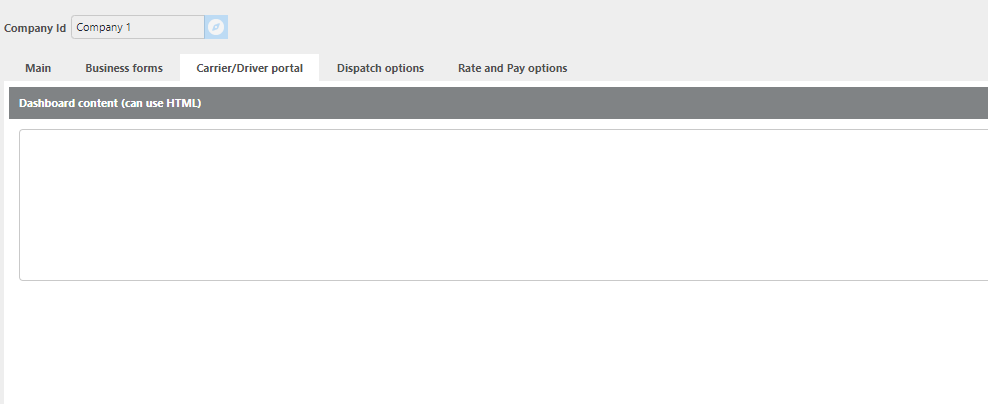 Dashboard Content | Enter the content that will be displayed on the dashboard for all driver and carrier portal users. This tab will not appear if your account does not have the Carrier/Driver Portal feature enabled. |