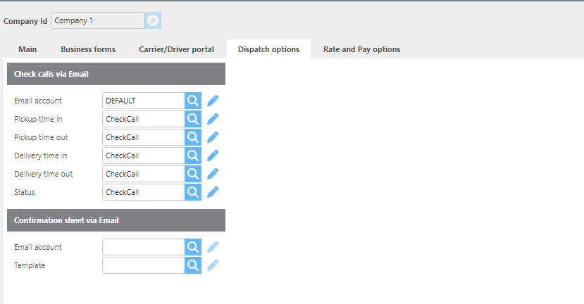 The Dispatch Options section allows you to configure which email account and templates this company uses for check call and confirmation sheet emails. These settings only need to be configured here if they differ from the defaults set in the Dispatch Setup Options.