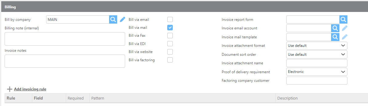 The Billing section is used to configure customer-specific billing preferences. Use this section if the customer requires a unique invoice format, a different sending email account, or custom attachment settings that differ from your account defaults.