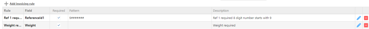 Invoicing rules can be used when a customer requires specific information on invoices, such as a particular PO number format or mandatory weight fields. To add a rule, click Add Invoicing Rule and complete the Rule Details prompt. Previously created rules will be listed below.