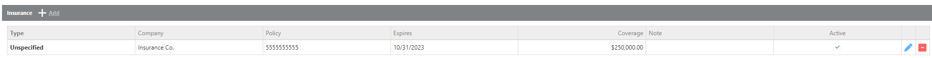 Insurance | Click Add to enter an insurance policy for this driver. You can then fill in the policy details. |