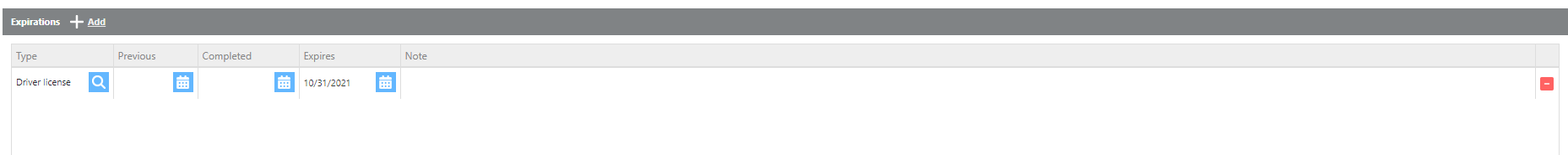 Expirations | Click Add to enter a driver expiration. Select the expiration type and enter the relevant dates. |