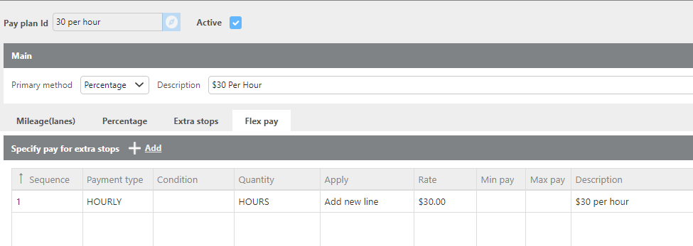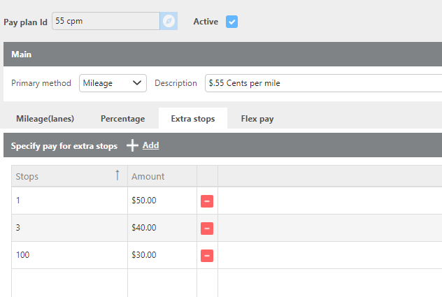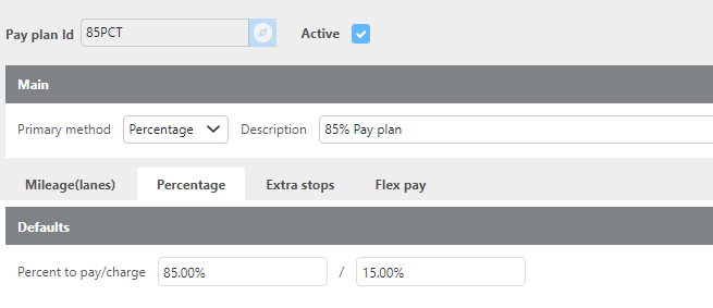Active | Check this box if this pay plan is currently in use. If unchecked, the plan will not be available for selection on carrier or driver profiles. |