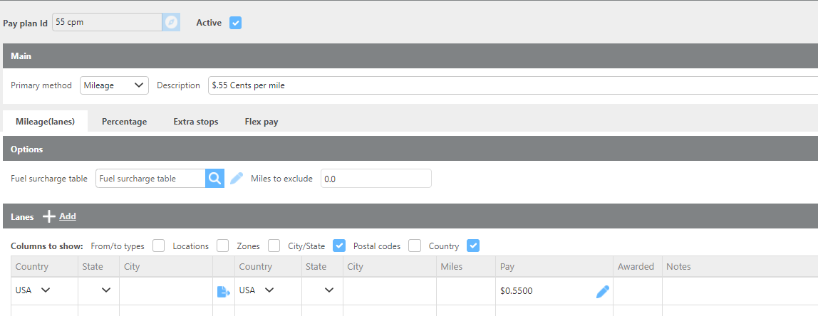 Lanes (seen below) | Define the areas and distance ranges that determine the pay rate. Lanes can be filtered by country, state, city, or zone, and each lane can have different rates based on total trip mileage. |