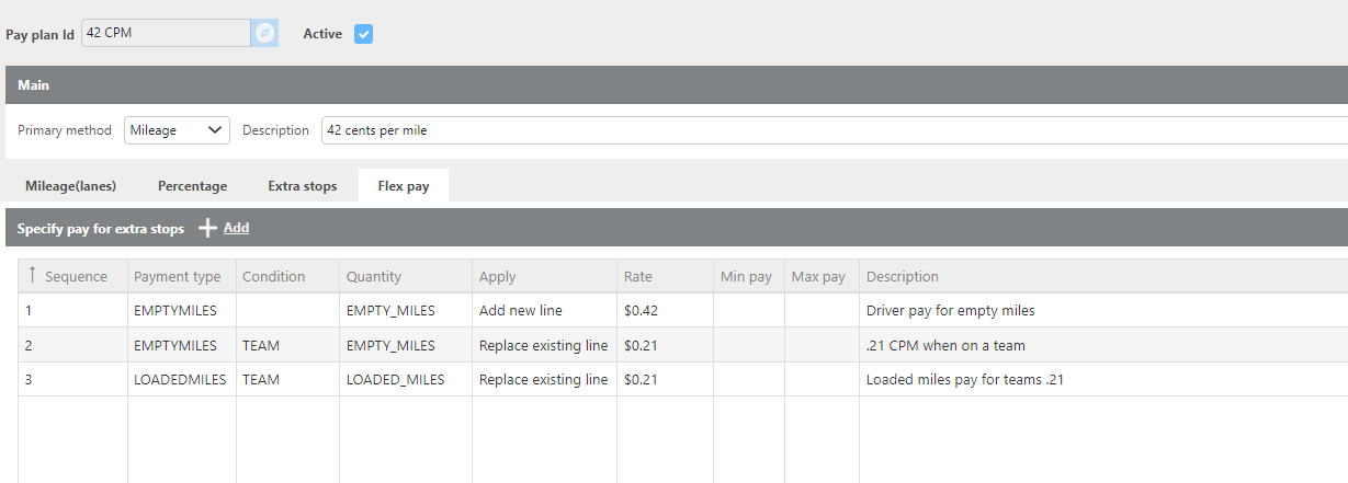 Example: A driver earning $0.42/mile is reduced to $0.21/mile when a team is assigned on the trip. A flex pay line is needed for both loaded and empty miles.