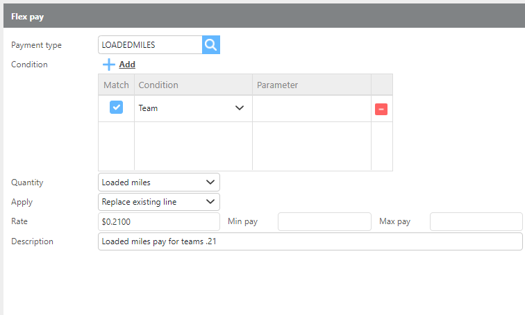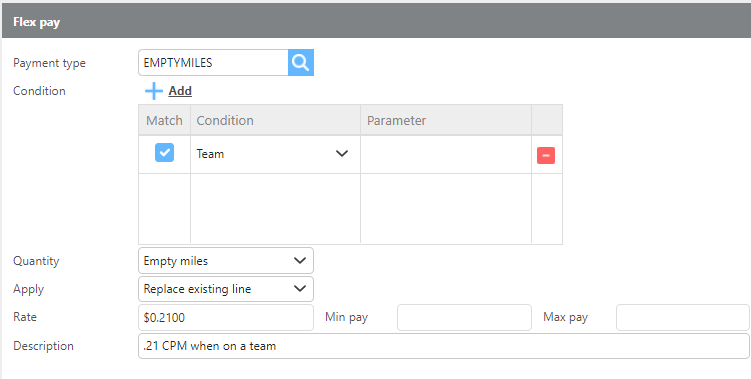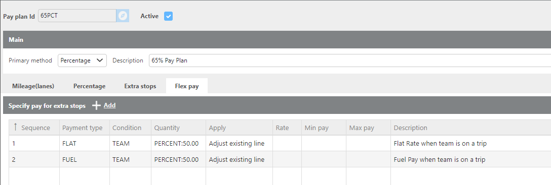 To reduce per-mile pay when a team is assigned, create a flex pay line for both the loaded and empty pay plans.