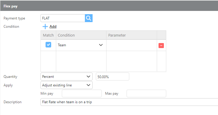 Flex Pay allows you to set up conditional "if/then" pay adjustments. Common uses include reducing pay for team drivers, setting up hourly pay, and configuring vendor pay scenarios.