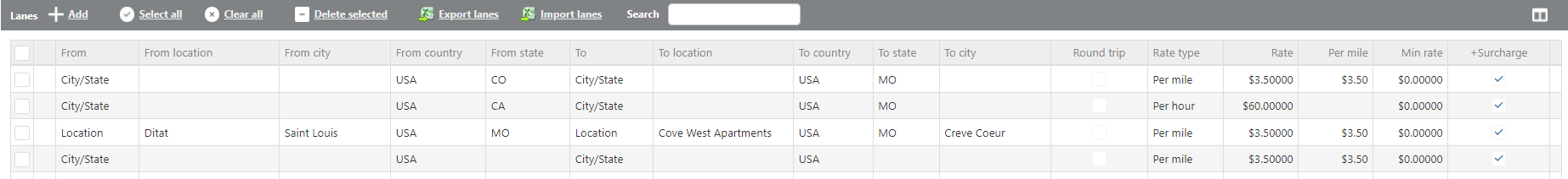 From | Select how to define the origin of the lane: Locations, Zones, City/State, Postal Codes, or Country. Check the corresponding box above the lanes to enable that option. |