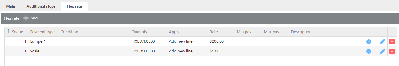 The Flex Rate tab displays all lane-specific flex rates and additional charges. Use the pencil icon to edit an existing flex rate or click Add to create a new one.