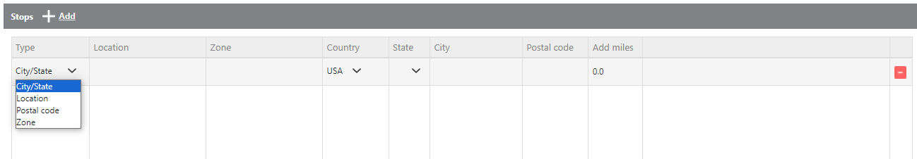 Type | Select how to define accepted extra stop locations: City/State, Postal Code, Location, or Zone. |