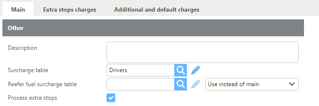 Reefer fuel surcharge table | Select a fuel surcharge table to use when a reefer is involved. This can be used instead of or in addition to the main fuel surcharge table. Use the drop-down to select how reefer fuel should be applied. |