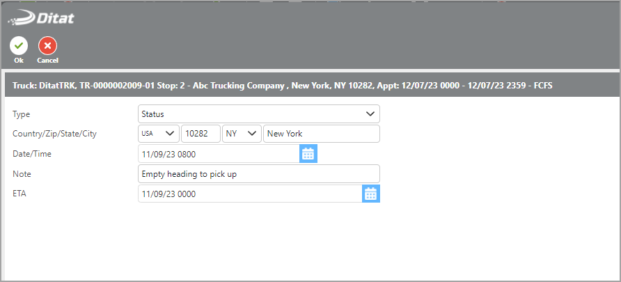 In addition to in/out times at each stop, status check calls can be added at any point during an enroute trip. To add one, change the Type to Status. This allows a timestamped note with an ETA to be recorded, updating the status of the load. Customers monitoring the Customer Portal will be able to see these status updates.