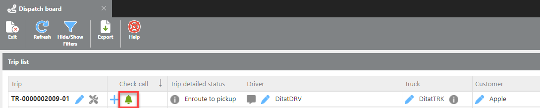 Drivers can submit check calls from their mobile devices while a trip is enroute. These appear on the Dispatch Board as a notification icon, alerting the dispatcher that a check call is pending.