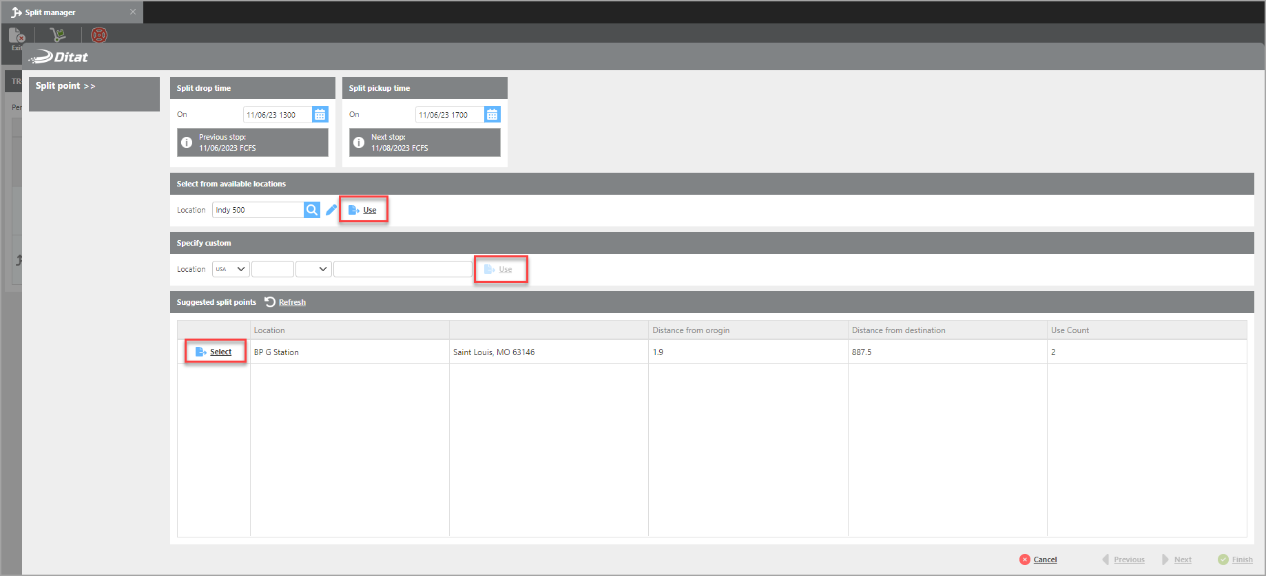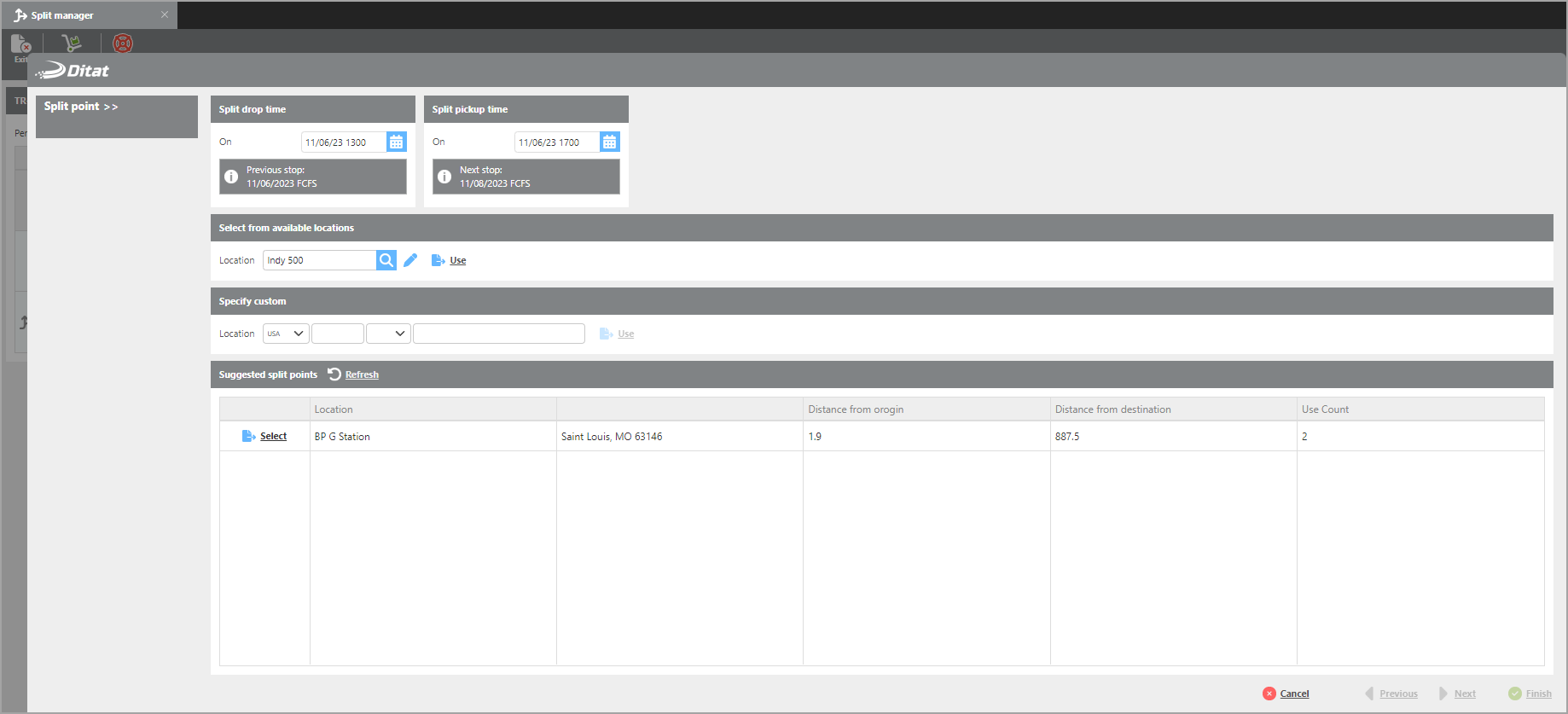 Use the Split Manager to split a shipment into multiple trip legs.