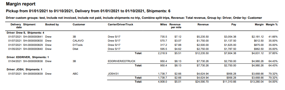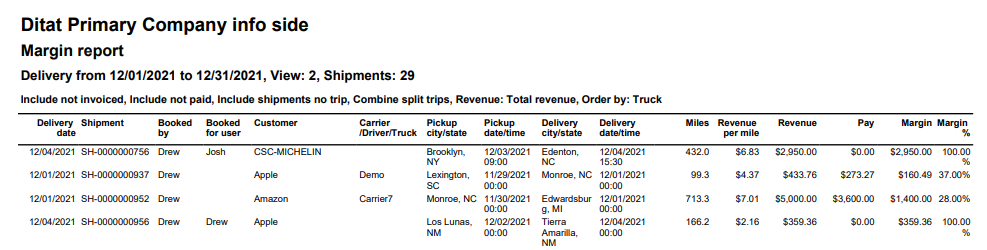 The margin details report is a shipment-based report that will show margin information. The report will show the miles for the shipment, revenue per mile, pay, advances, and the margin on the shipment. This report has options to include not invoiced and not paid shipments as well as shipments that have no trip.